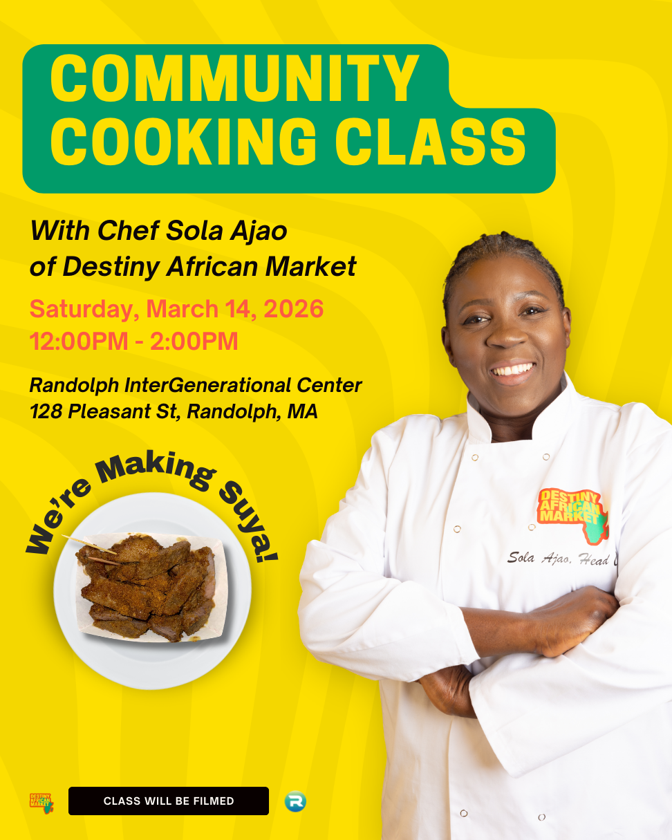 Learn how to make Suya (grilled beef) from local small business owner Sola Ajao. This class will be held at the Randolph Intergenerational Community Center at 128 Pleasant Street from 12-2PM. Registration is required as supplies are limited and on a first come, first served basis.