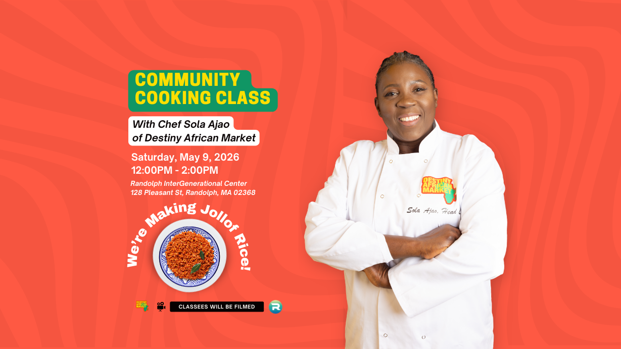 Join us for a FREE community cooking class to celebrate DAM FAM DAY 2025 event in collaboration with the Randolph InterGenerational Center on May 9, 2026! We will be making our now customer favorite jollof rice. A smoky, spicy, and savory West African rice dish.